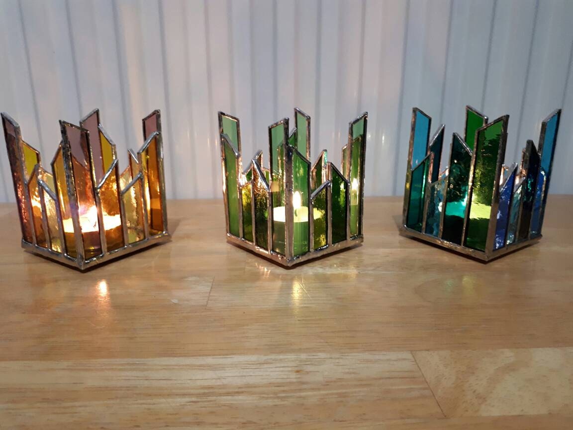 This handcrafted stained glass tealight holder will add a unique flair to any home decor. Showcasing a modern art deco geometric design and beautifully crafted glasswork, it's the perfect gift. Create a warm and inviting atmosphere with this geometric tealight holder.